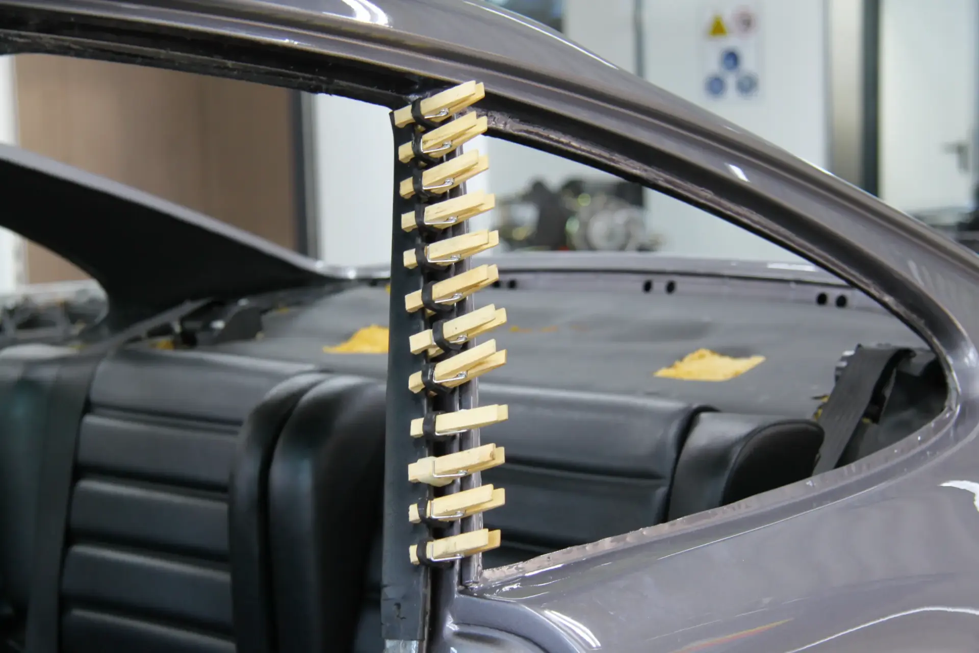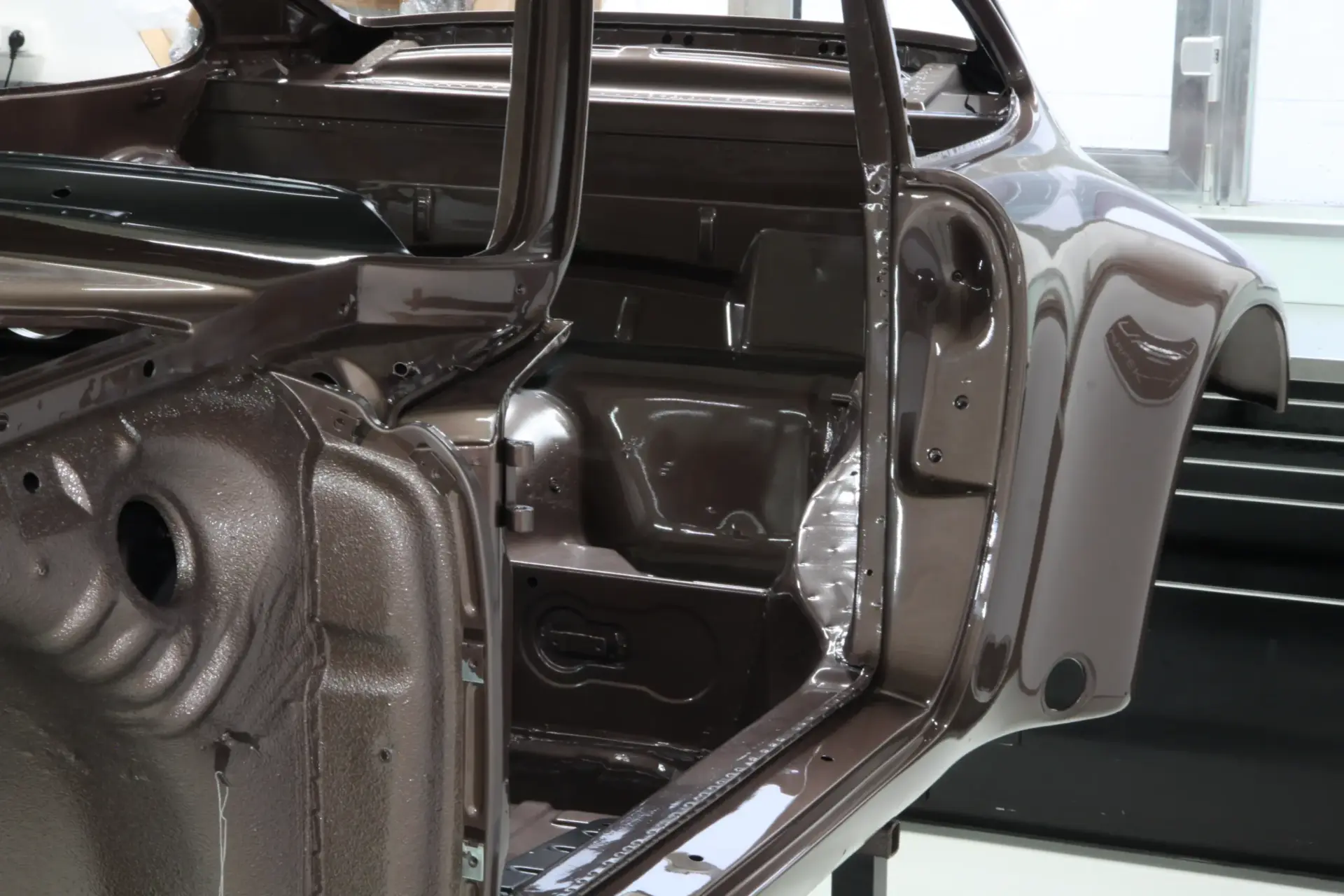 Im anschließenden Trockenofen wird die Beschichtung bei etwa 175–180 °C fest eingebrannt. Danach kehrt die Karosserie inklusive aller Anbauteile zurück zu uns.
