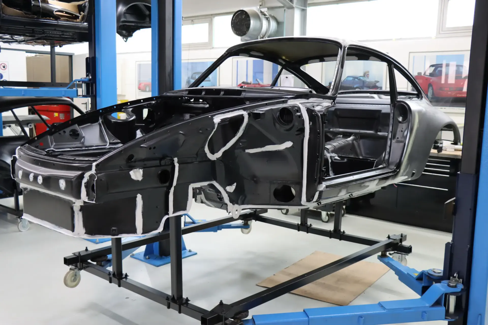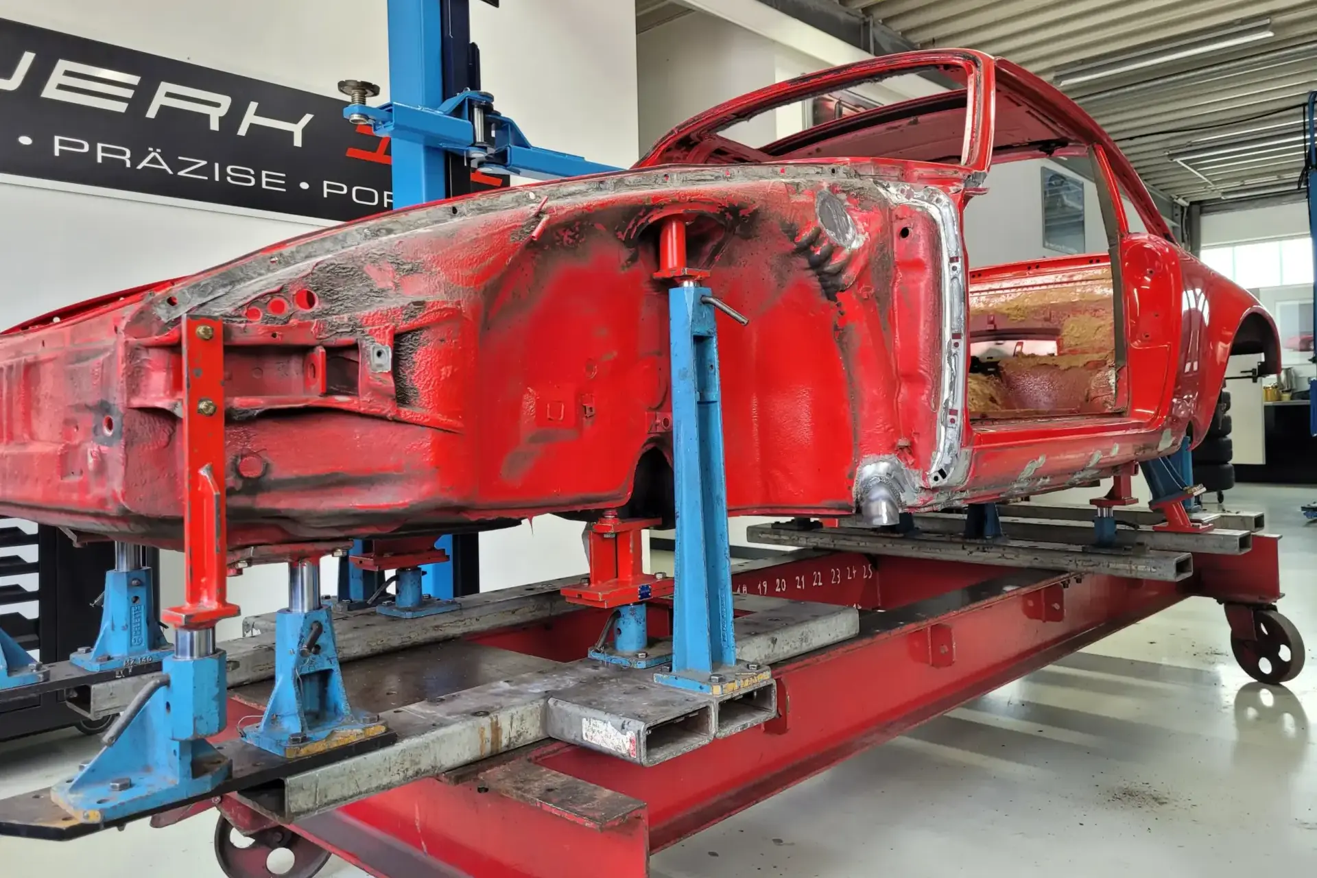Für strukturelle Arbeiten verfügen wir über eine Celette-Richtbank mit altem Lochmaß – exakt der Richtbanktyp, der seinerzeit für den Porsche 911 verwendet wurde. So stellen wir sicher, dass Geometrie und Maßhaltigkeit dem Original entsprechen.